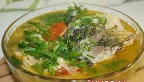 - Cho đầu hành lá và trái dọc vào xào, sau đó bỏ vào nồi nước dùng đã sôi, tiếp tục bỏ cá đã chiên vào, đun nhỏ lửa. Khi cá chín, cho cà chua, nêm gia vị vừa ăn. Trước khi tắt bếp, cho hành và thì là vào.